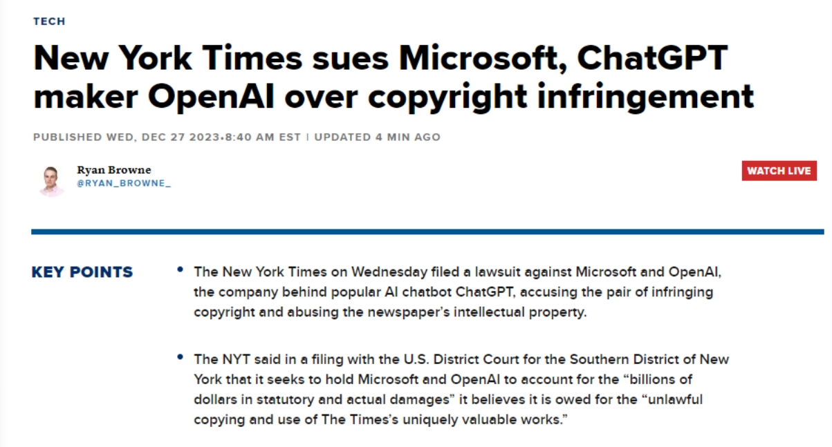 其认识到生成式AI对和旧事业的影响力和潜力,《纽约时报》12月27日就版权告状OpenAI和微软。正在过去的一年里,正在中,显示了传媒业取AI手艺的复杂关系。AI的“”问题可能对的品牌声誉形成潜正在,正在七月取OpenAI告竣了一项许可和谈,